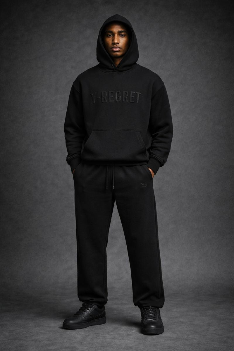 The oversized hoodie features a centrally placed, tone-in-tone 3D embroidered Y-REGRET logo, intentionally subtle for maximum elegance.